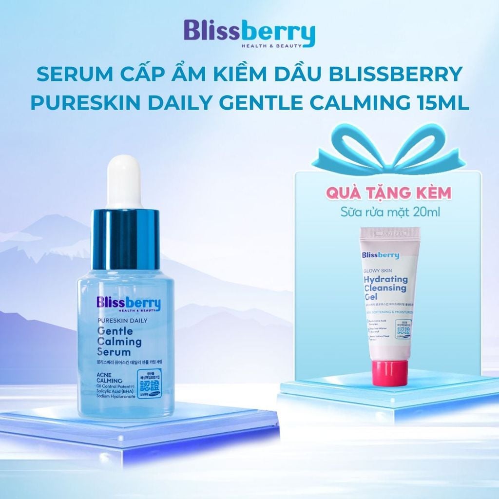 Serum cấp ẩm dịu da Blissberry Daily Gentle Calming 15ml có khả năng cấp ẩm, làm dịu da, kiểm soát bã nhờn cũng như giảm mụn, kháng viêm tốt nhờ các chiết xuất thiên nhiên như rau má, súp lơ, salicylic acid, tinh dầu tràm trà, hoa oải hương…