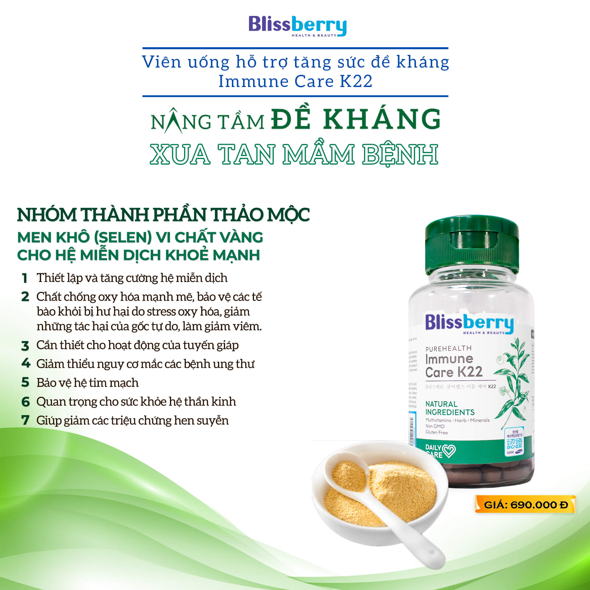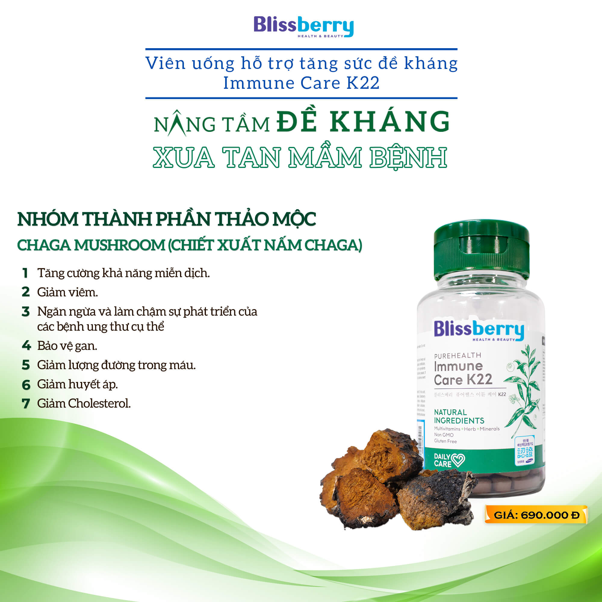 Viên uống tăng sức đề kháng Blissberry Purehealth Immune K22 chứa các thành phần thảo mộc như nấm Chaga, men khô và kẽm, tảo biển giúp tăng cường hệ miễn dịch, chống oxy hóa, kháng viêm và hỗ trợ chữa lành vết thương cực tốt.